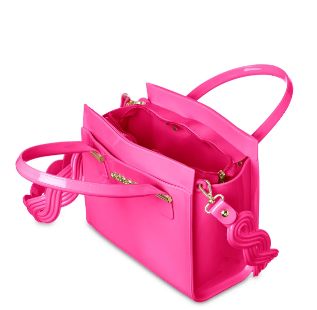 - Bolsa Love Petite Jolie Rosa, feita totalmente em J-Lastic. Tem alça de mão, e alça transversal com um detalhe tipo costura, um arraso. É muito charme, ela tá super chique! Dimensões: 21x22x11,5cm